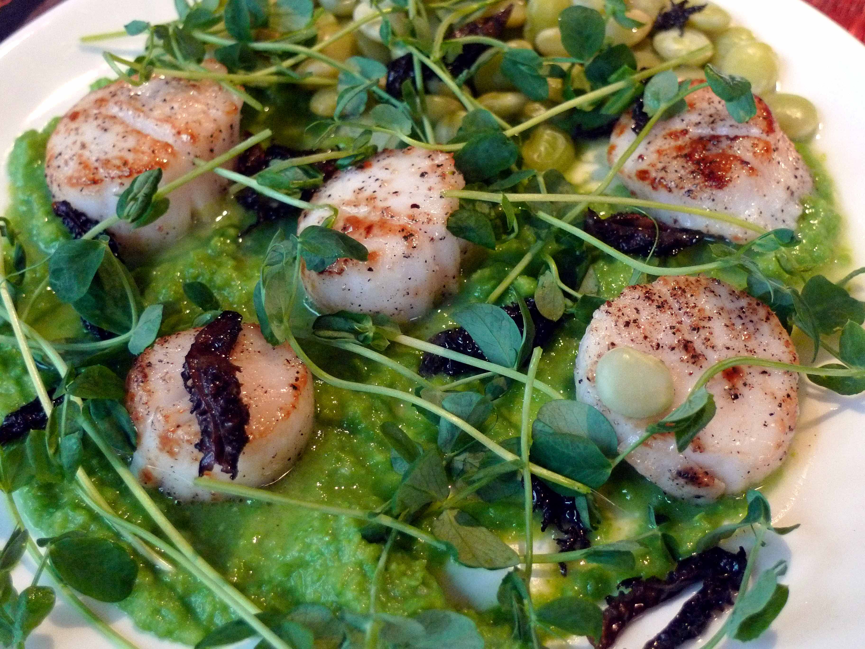 To assemble the dish, place a spoon of pea purée in the middle of the plate, place the scallops, lima beans, and morels around and garnish with the pea shoots.