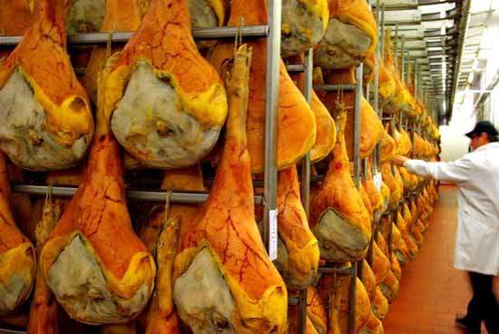 The Legends from Europe folks passed along a packet of prosciutto di Parma, the most familiar of the Italian raw hams seen in the U.S. and the one most imitated by American and South American producers. To qualify for the PDO label as prosciutto di Parma, the ham must come from pigs fed a special diet and raised in a defined north-central region of Italy. Additionally, the ham must be cured in the countryside near Parma in Emilia-Romagna. Much of the intense flavor comes from applying just enough salt to keep the ham “sweet” and then aging it at least 400 days. (The photo above shows whole hams hanging in a chilled aging room in Italy.)