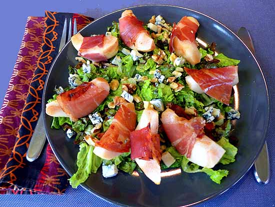 Parma prosciutto is the most intense of the Italian raw hams and stands up well to other strong flavors. It is often paired with melon and even combined with Gorgonzola cheese on pizzas. But melon is out of season, so I decided to try the prosciutto di Parma with some gorgeous but firm Anjou pears. I peeled the pears, cut them in eighths, wrapped prosciutto around each wedge, and roasted them for four minutes under a broiler.