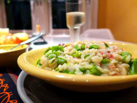 Although the Friulani love their asparagus (see my posts from May 2009), the only time I’ve ever eaten asparagus risotto in Friuli, it was made with white asparagus. The Friulani version was silken and smooth and very pale. Oddly enough, I had often been served cold steamed asparagus wrapped in prosciutto, and Pat and I wondered why we’d never seen a risotto that combined the two. Since we had some extra prosciutto di San Daniele available, I thought I’d see how the delicate ham would be in risotto with Grana Padano, a more understated grating cheese than Parmigiano. Local asparagus isn’t in season, but I was lucky to get some plump, crisp spears that had just come off the plane from Peru.