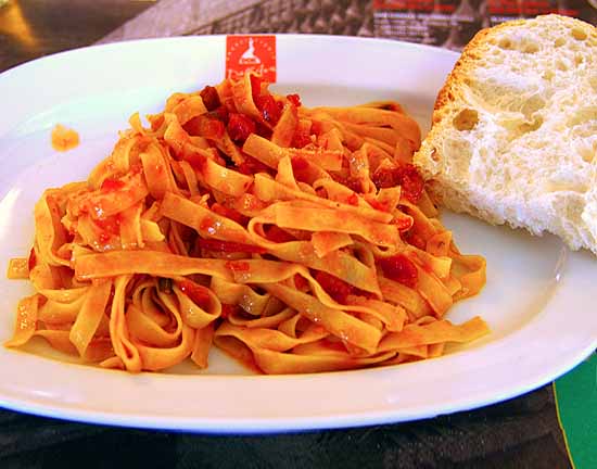 It’s a funny place, since it’s outside the main village and near one of the prosciutto factories. It looks like a tourist trap, to be honest, and bus groups stop here. But the service and the food are both terrific and the prices, while not cheap, are pretty reasonable for top-quality prosciutto. We shared lovely plates of sliced prosciutto, prosciutto and melon, and prosciutto and asparagus, and we each ordered a small individual plate. Mine was as simple as it gets – fresh pappardelle tossed with prosciutto and hastily sautéed tomatoes.