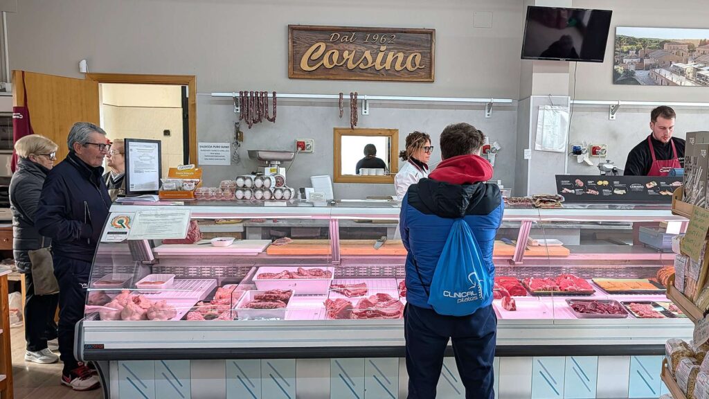 Still on our quest for the traditional sausage, we found our way to one of the few butchers still making it: Marcelleria Corsino (Via Antonello da Messina, 2; +39 0931 881568; macelleriacorsino.it ). The sausage is made of nine cuts from the local breed of black pigs. Corsino’s swine and cattle graze at its organic farm and woodland. The meat is coarsely chopped by hand and packed into natural casings. Fat is limited to a quarter of the volume, and the sausage is flavored with salt, black pepper, a pinch of hot red pepper, wild fennel seeds, and Nero d’Avola red wine. Since we had no cooking facilities, we didn’t buy any of the traditional sausage, opting instead for a slab of aged pecorino cheese and about 400 grams of cured salami.