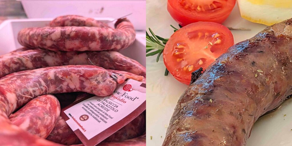 Our needs, however, were simple. We wanted to try the traditional sausage of Palazzolo Acreide with a green salad on the side and a half liter of the house white. The wine was bracingly cold and fresh (a blend of Grillo and Insolia, we think); the green salad was crunchy and almost sweet. The grilled sausage (below) was salty and hearty. The coarse chop of the meat gave the sausage a distinct toothiness. With a small squeeze of lemon, it was pork heaven — well deserving its Slow Food recognition.