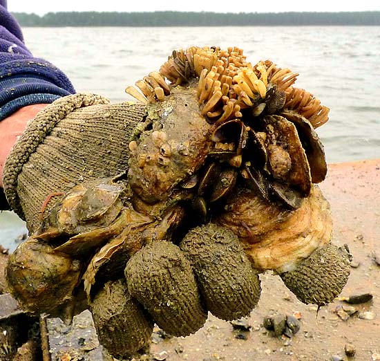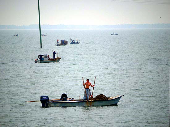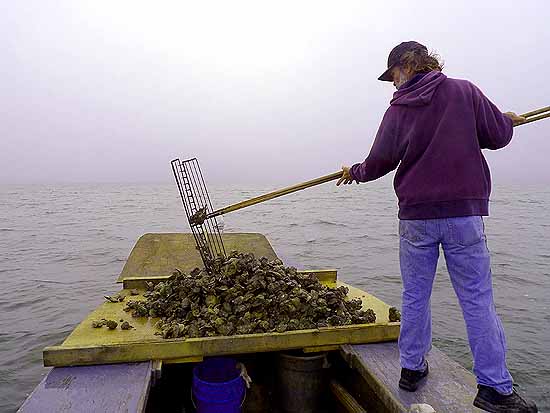 Tonging is intensely hard work – reaching down to the bars, closing the rakes, and hauling the catch to the surface. Schoelles did it methodically, moving the boat a few feet every few minutes, until we had a huge heap of oysters and other sea life on the deck. With the sun trying to peek through the fog behind him, he seemed to glow beatifically.