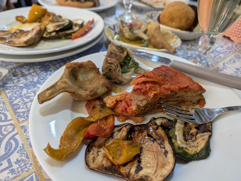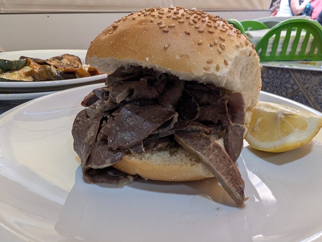 When we finally couldn’t take it any more, we stopped at I sapori di Ballaro, a little eatery with an incredible display of traditional dishes. It’s at Piazza Ballaro, 10. We indulged in torta of eggplant, grilled vegetables, fried artichokes, and the most unusual but truly local dish, a spleen sandwich. Below are the pretty food — and then the spleen sandwich. For the uninitiated, spleen tastes like very mild, very tender liver with some of the same kind of stringy bits between the soft meat. The lunch was a great introduction to Palermo street food. We’ll be having everything else again (and again). Except the spleen sandwich.